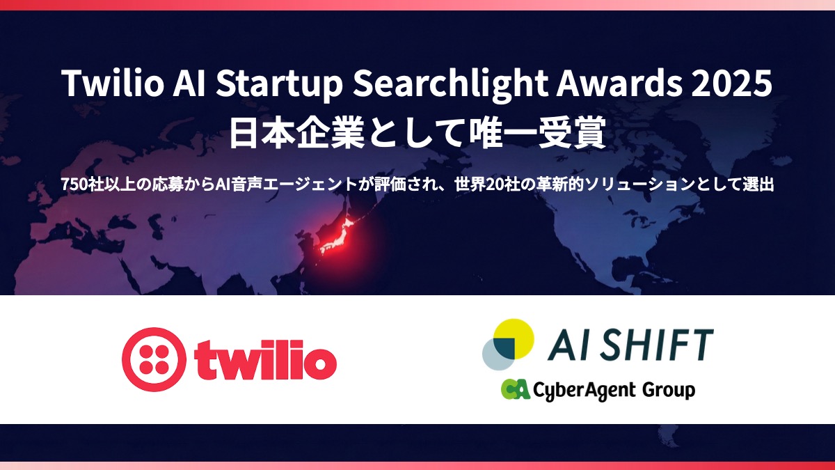 株式会社サイバーエージェント(本社:東京都渋谷区、代表取締役社長:山内隆裕、東証プライム市場:証券コード4751)の100%子会社である株式会社AI Shift(本社:東京都渋谷区、代表取締役社長:米山結人、以下AI Shift)は、Twilioが主催する「AI Startup Searchlight Awards 2025」において、AI音声エージェントソリューション「AI Worker VoiceAgent」が評価され、日本企業として唯一受賞企業に選出されました。