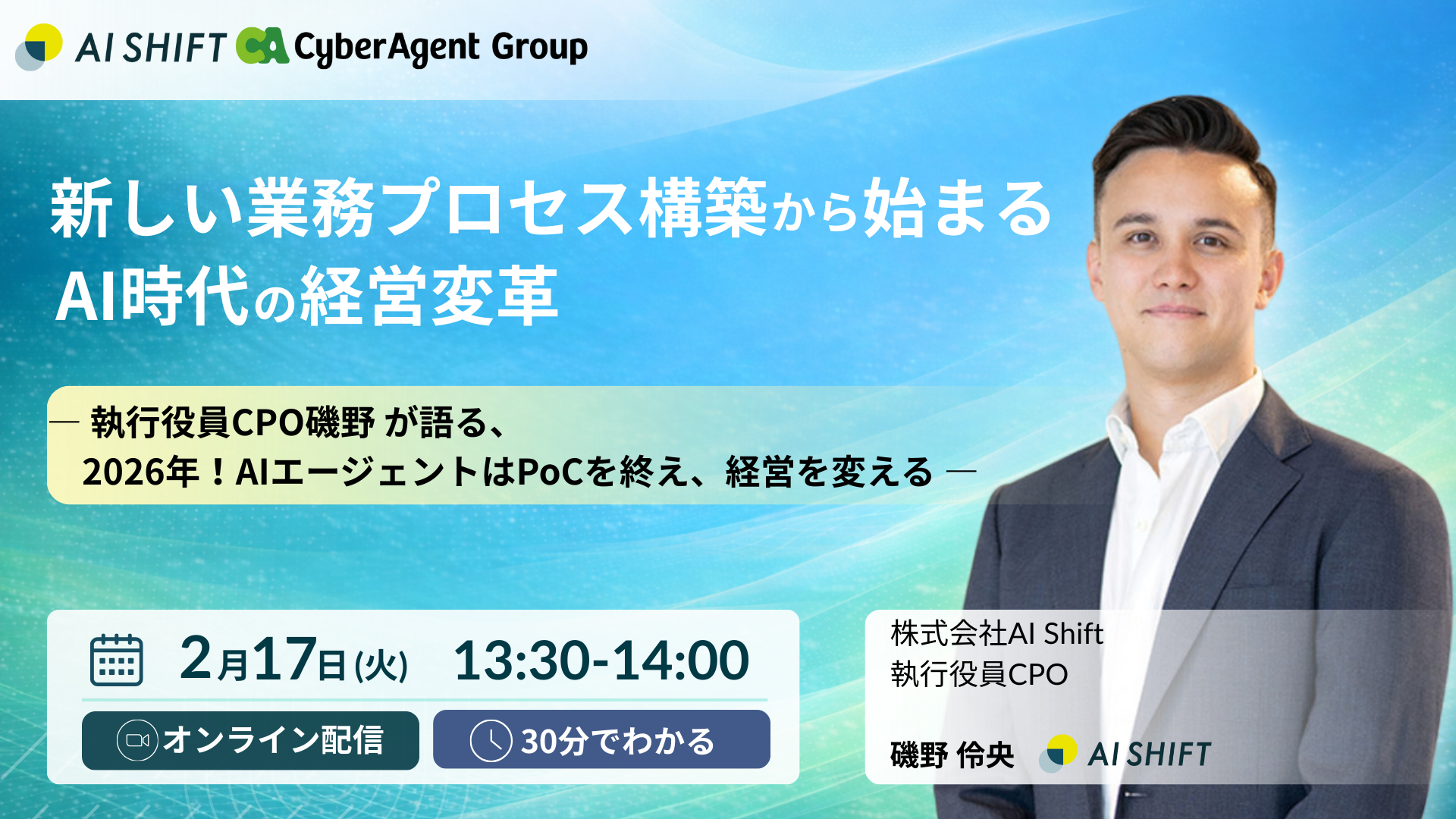 本セミナーでは、AIエージェント時代の最新動向を踏まえ、CPO・磯野の視点から、営業を起点に経営を変革するための新しい業務プロセス構築におけるヒントを提供します。なお、本内容は先日開催した「AI SHIFT SUMMIT 2026 Winter」にてご好評をいただいたセッションに加え、当日お伝えしきれなかった内容を加えてお届けいたします。