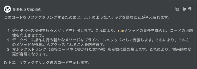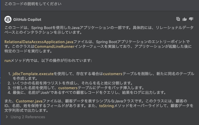 /explainというコマンドで現在開いているコードの説明もできますが英語で返ってくるので今回は日本語で指示しています。