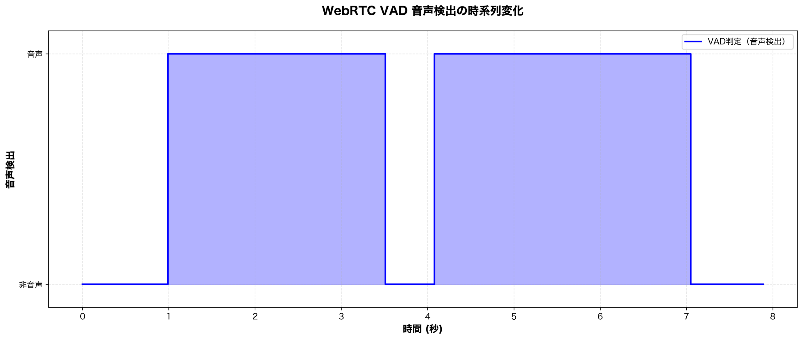 本当にこれが難しい問題なのかを、Whisperと合わせてよく使われるVADライブラリのwebrtcvadを使って確認してみたいと思います。コードは同様にGistにアップロードしており、こちらを実行すると以下のような結果になりました。