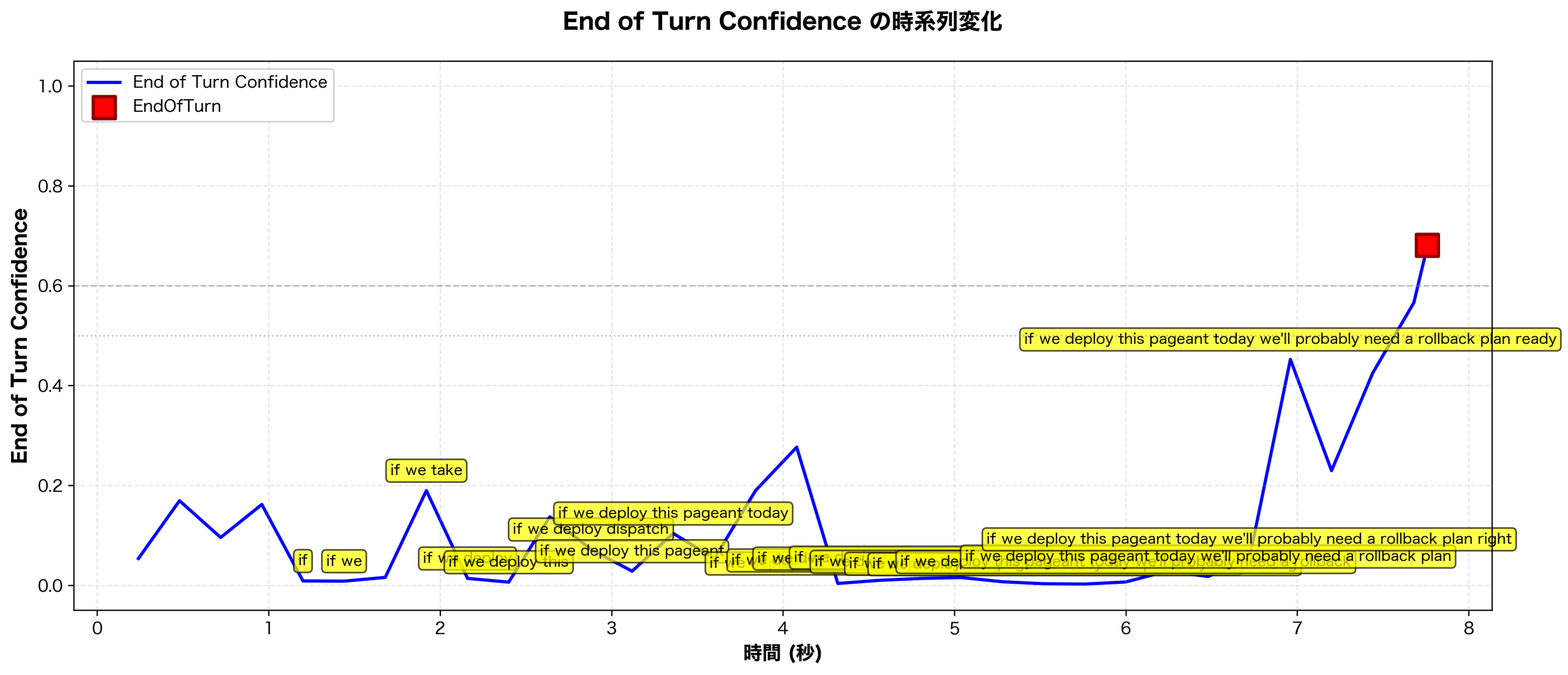 少し認識結果が重なって見えにくいですが、4秒くらいのカンマ部分で若干end_of_turn_confidenceが上がりつつも、EoT認識を抑えたのが確認できます。これは、Fluxが音響的な無音だけでなく、発話構造の文脈情報を参照していることを示しています。つまり“If we deploy this version today, …” のように条件節が続く構文では、文が完結していないことをモデルが理解し、一時的に end_of_turn_confidence
