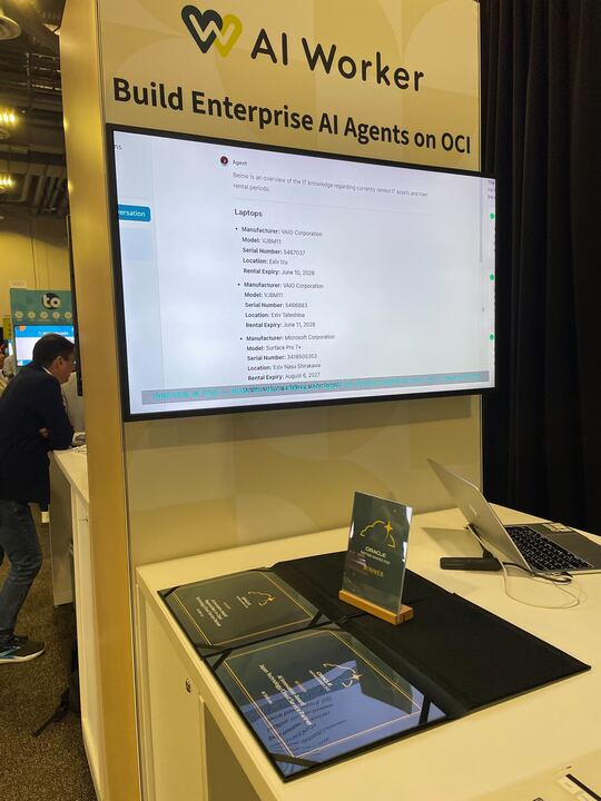 Oralce Group VP および VP の方と一緒に登壇し、弊社製品の AI Worker がどのように Oracle 製品と連携しているかなどの発表を行いました。