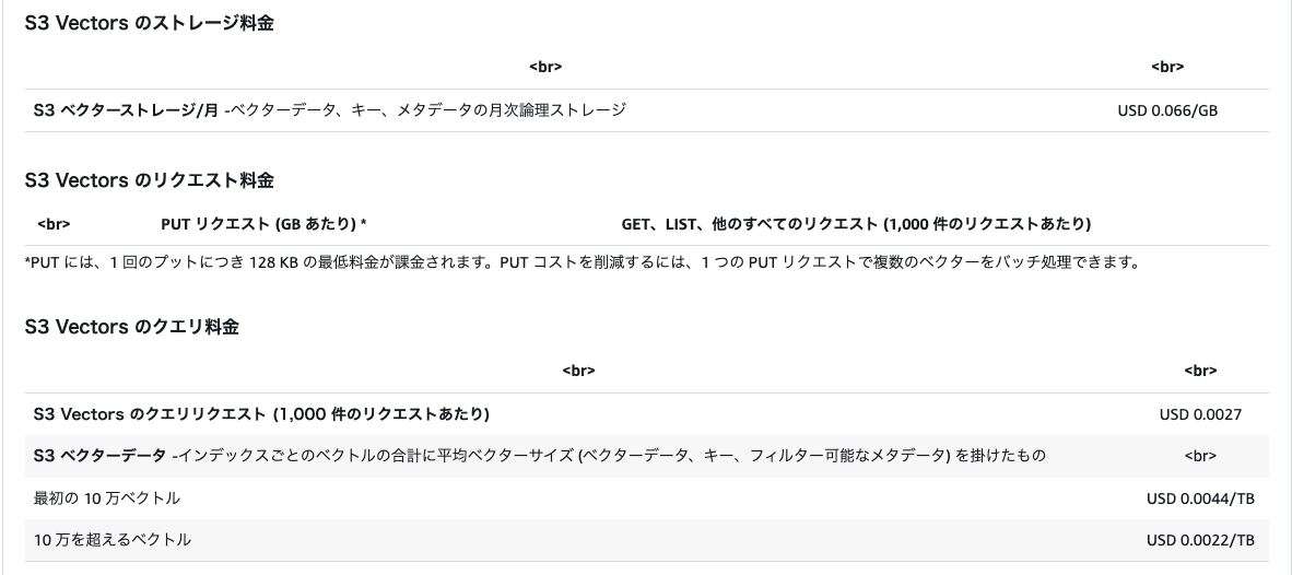 | S3 Vectors | 1TB (1024GB) | 160円 * (0.066$ * 1024GB + 0.0027$ * 10 (千Req)) | 10,817円 (概算) |