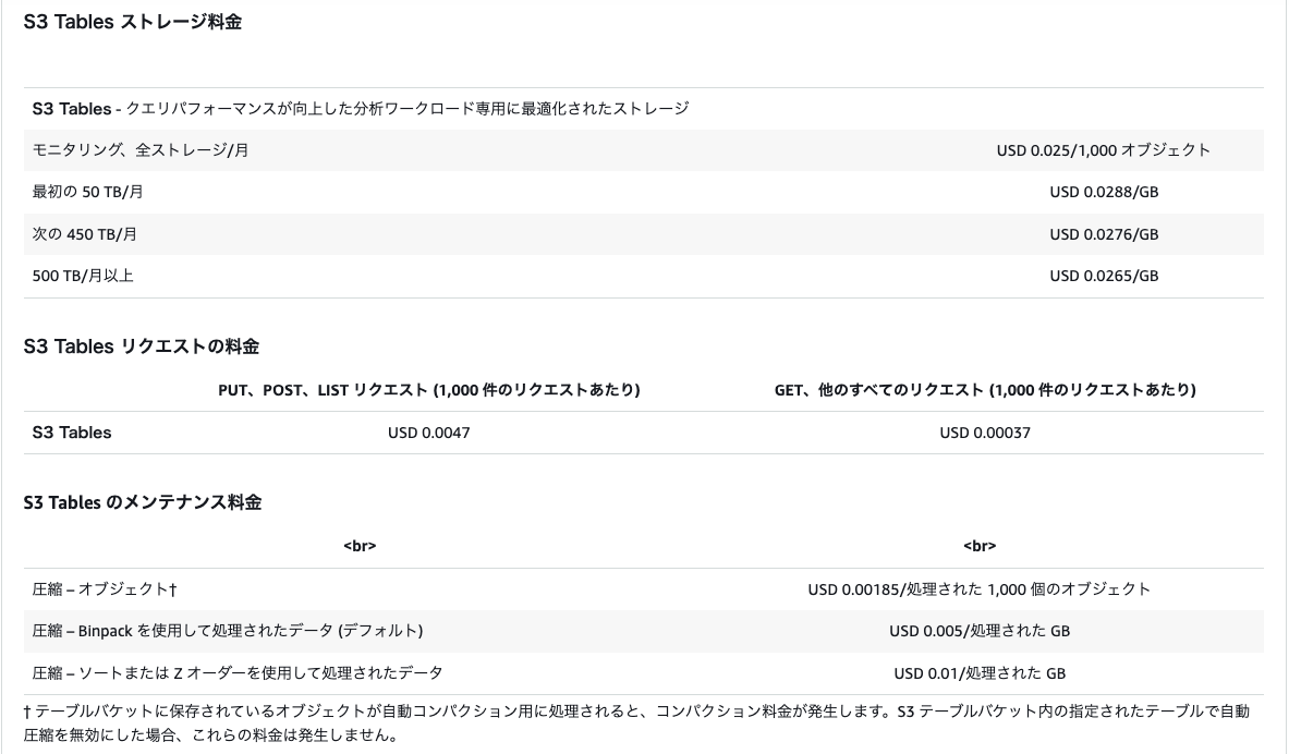 | S3 Tables | 100GB | 160円 * (0.028$ * 100GB + 0.000378$ * 10 (千Req)) | 448円 + 最適化費用 (概算) |