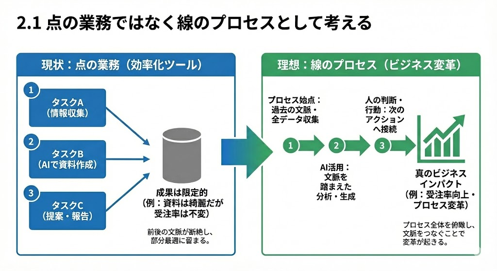 もし「提案資料作成」という点の業務だけを切り出してAI化してしまうと、それなりに綺麗な資料は作れるようになりますが、受注率そのものは変わらない、という結果になりがちです。