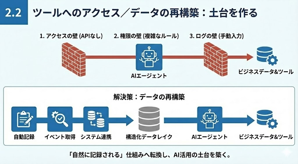 ツールへのアクセス設計やデータの再構築は、AI活用の文脈ではつい後回しにされがちなテーマです。しかし実際には、この部分をどれだけ丁寧に設計できるかが、AIエージェント活用の成否を大きく左右します。