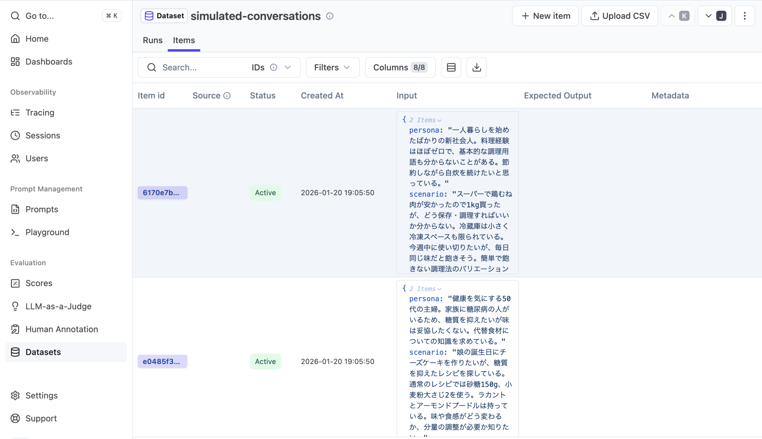 - データセット準備: 評価したいペルソナとシナリオをDatasetとしてLangfuseに登録