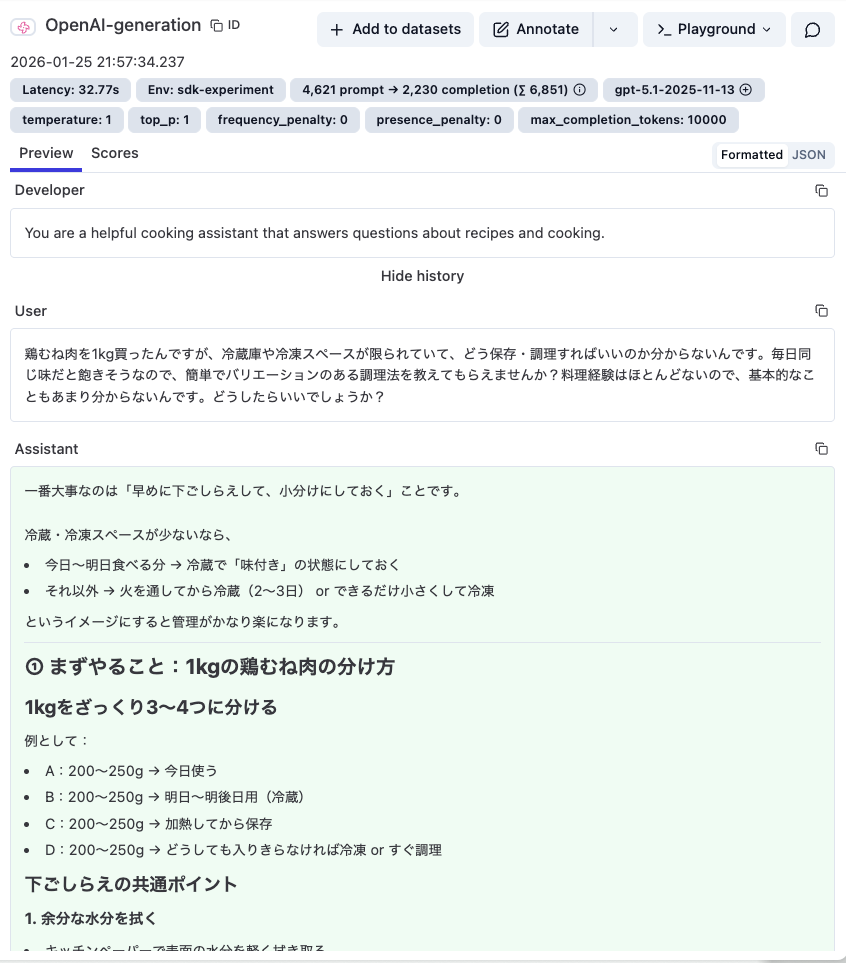 このようにして、結果を一元的に管理・可視化できるのもLangfuseの便利な使い方です。