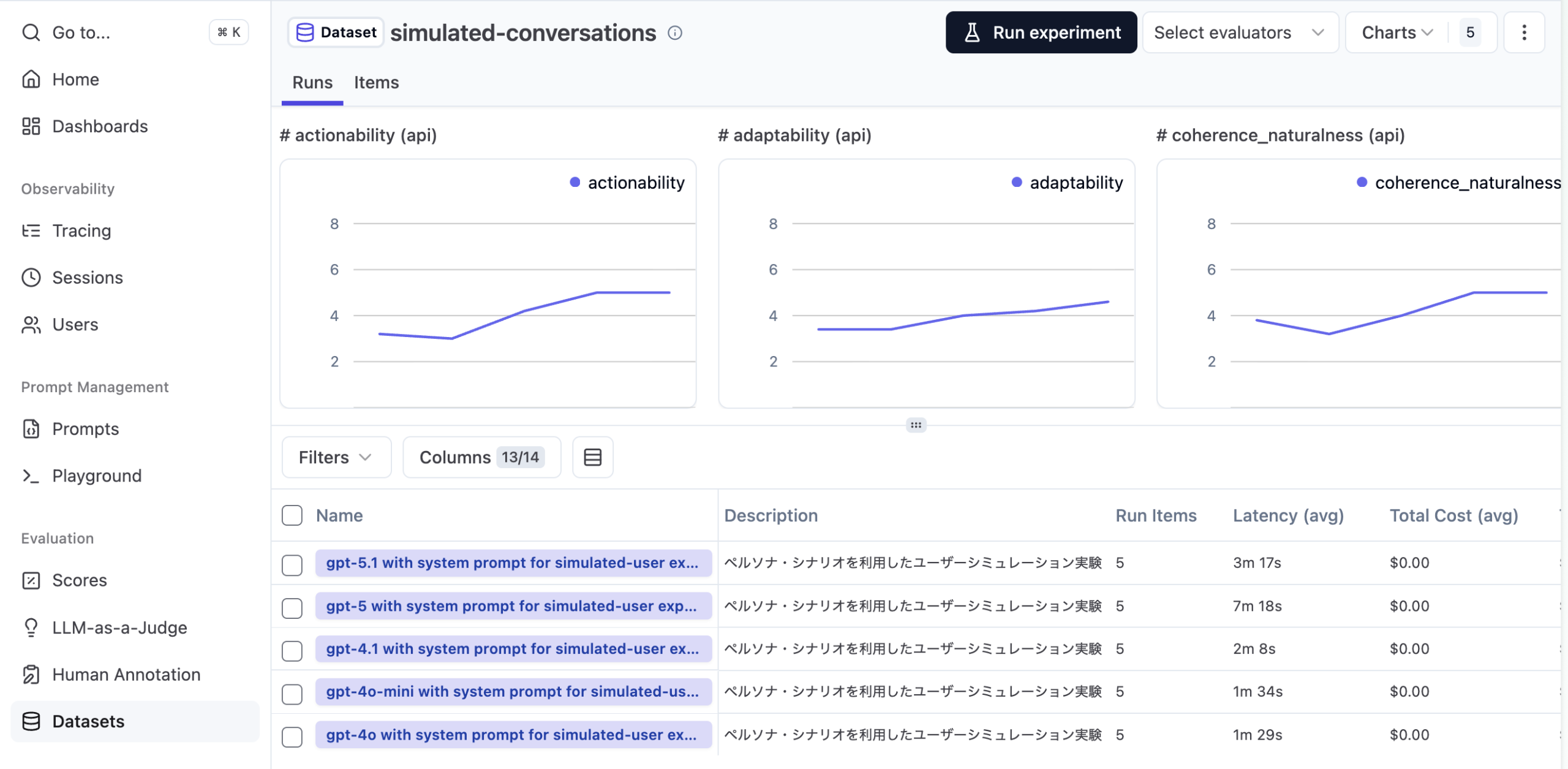 この記事ではOpenEvalsとLangfuseを用いて、マルチターン対話実験を総合的に実行・管理してみました。両者をうまく組み合わせることで、シングルショットor最終成果物を対象とするだけでは難しい「対話力」についての実験・評価が手軽に実現できました。