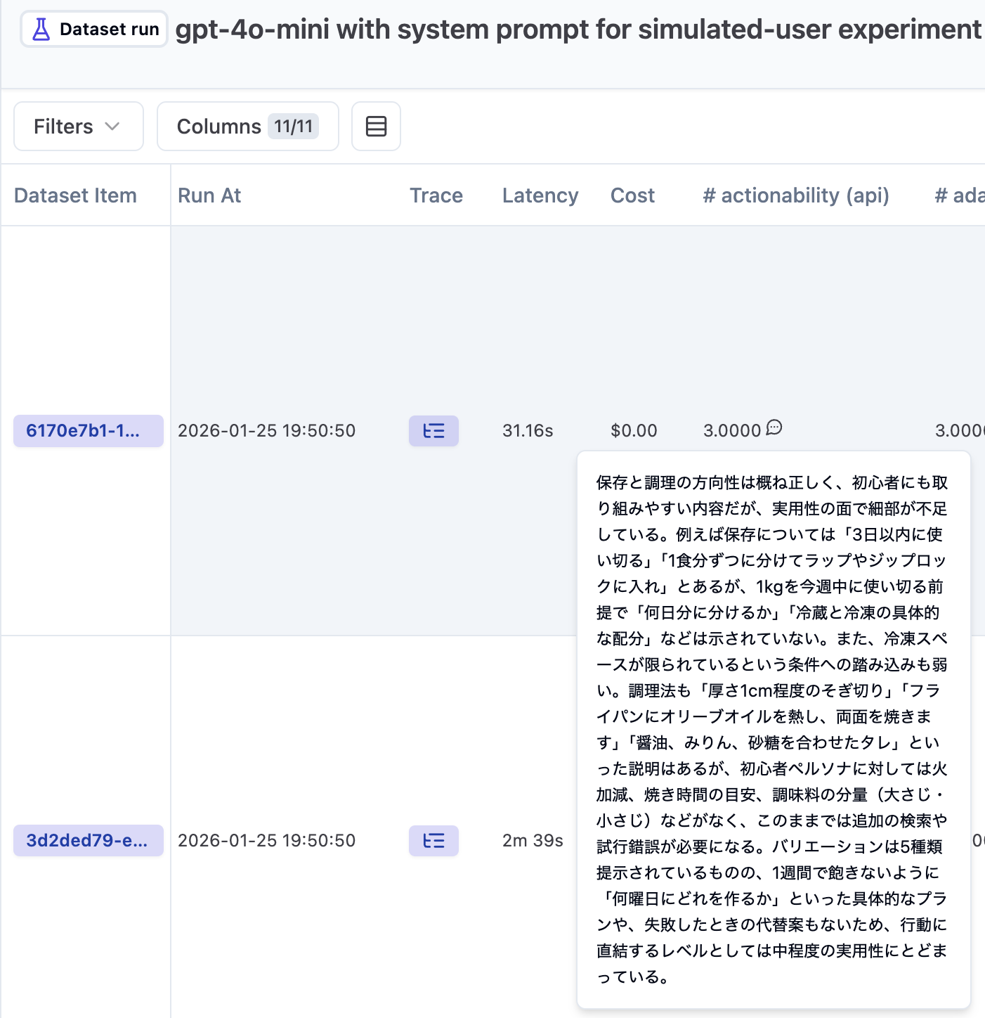 Langfuseのrun_experiment機能を使って、データセット内の各アイテムに対してシミュレーションを実行し、結果を記録します。